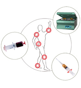 Bei unseren Patienten, die sich für diese alternativmedizinische Behandlungsmethode entschieden haben, erfolgt im Rahmen der Sprechstunde eine Blutentnahme aus der Armvene. Das gewonnene Blut wird mittels eines speziellen Spritzensystems und einer Zentrifugenanlage direkt in der Praxis steril aufbereitet. Dabei werden wirksame Wachstumsfaktoren und körpereigene, entzündungshemmende Transmitterstoffe im Blutplasma hochkonzentriert und von den übrigen Blutbestandteilen abgelöst. Nach dem nur wenige Minuten dauernden Reinigungsprozess kann das gewonnene Eigenplasma direkt in das betroffene Gelenk injiziert werden, um dort seine heilende Wirkung zu entfalten. Diese Behandlung wird 3-5 mal im Wochenabstand durchgeführt. Nebenwirkungen (außer den allgemein möglichen Nebenwirkungen einer Spritze in den Gelenkbereich) sind nicht zu erwarten, da es sich um das körpereigene Blutplasma des Patienten handelt. Eine kurze Darstellung der wissenschaftlichen Grundlagen mit einer Auswahl an aktuellen Studienergebnissen finden Sie weiter unten auf dieser Seite.