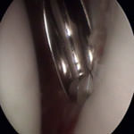 Abb. 16 bis 18: Transport der Fäden durch den Labrum-Kapsel-Komplex und anschließend endoskopisches Knoten. Die überstehenden Fäden werden mit einem Spezialinstrument abgeschnitten. Durch die Knoten kann eine stabile Wiederanheftung der Gelenklippe am Pfannenrand erreicht werden, in Kombination mit einer Straffung der gedehnten Gelenkkapsel (Kapselshift). In Fällen mit Bildung einer ausgeprägten Kapseltasche könne zusätzliche Straffungsnähte/ Intervallnähte angelegt werden.